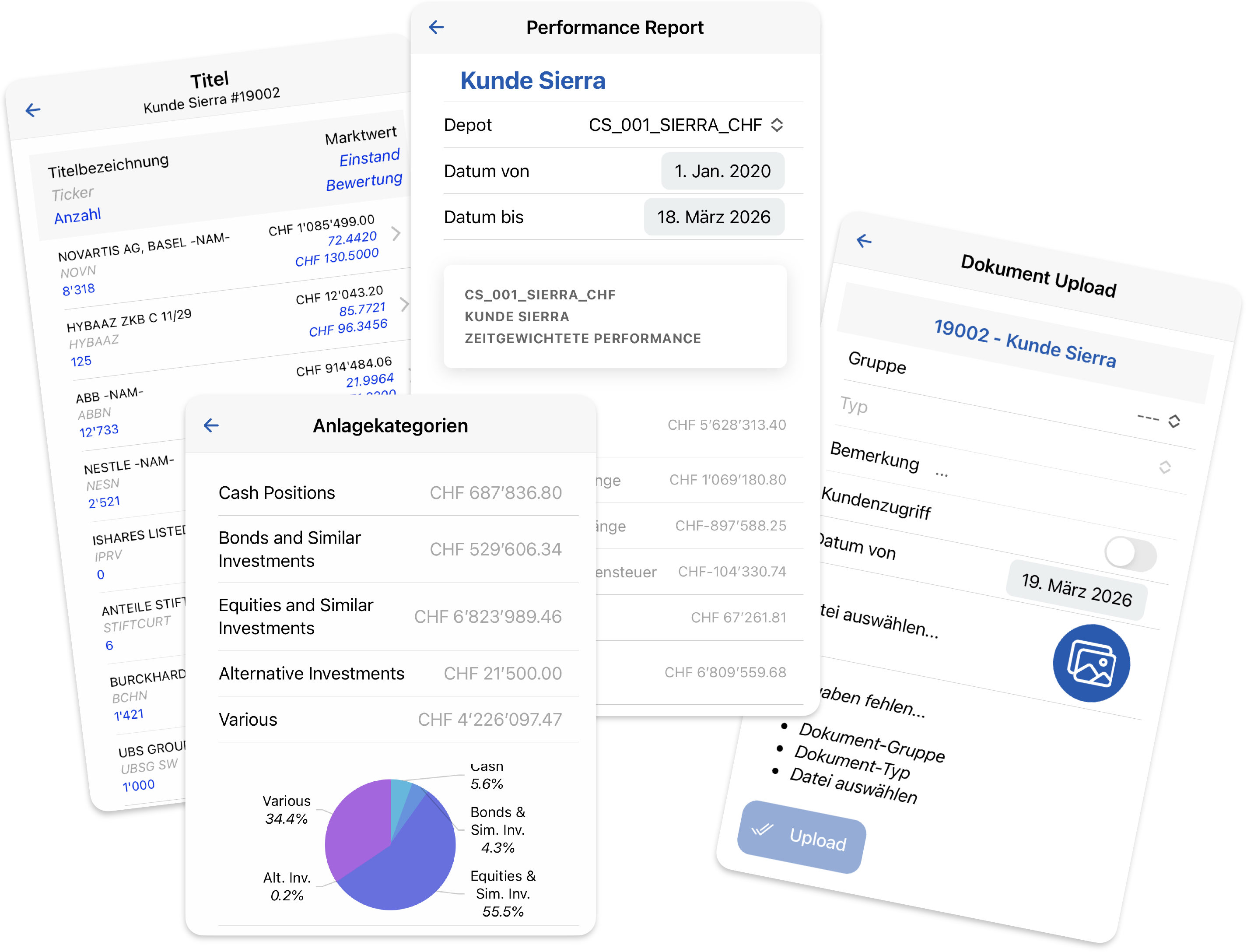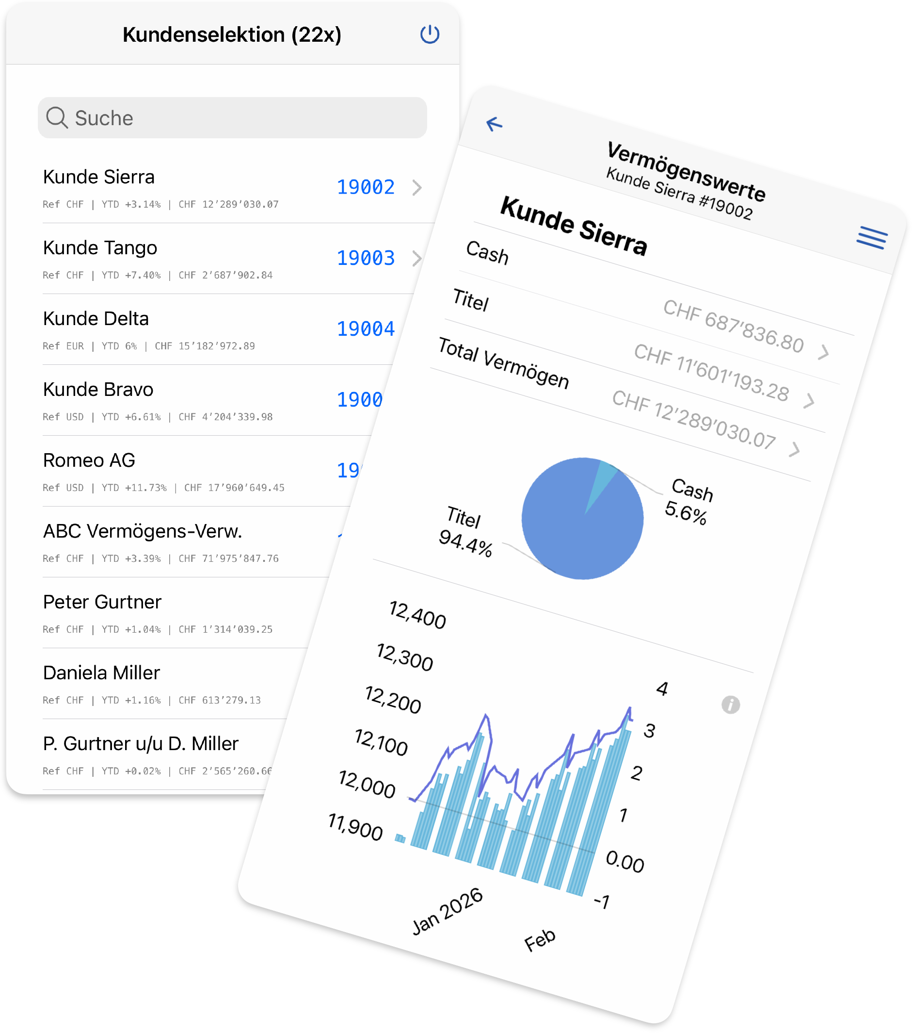 Unsere Mobilapp mit Portfolio-View ermöglicht es dem Kunden, wie auch dem Asset Manager die Portfoliopositionen und Transaktionen einzusehen und das Dokumentarchiv zu bewirtschaften. Our mobile app with portfolio view allows both the customer and the asset manager to view portfolio positions and transactions and to manage the document archive.