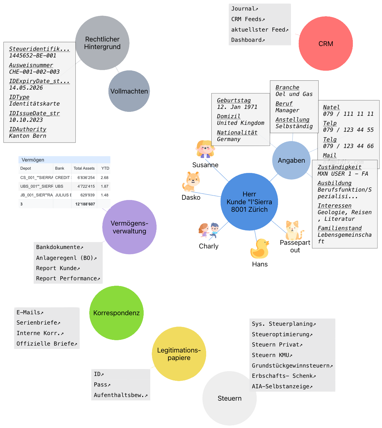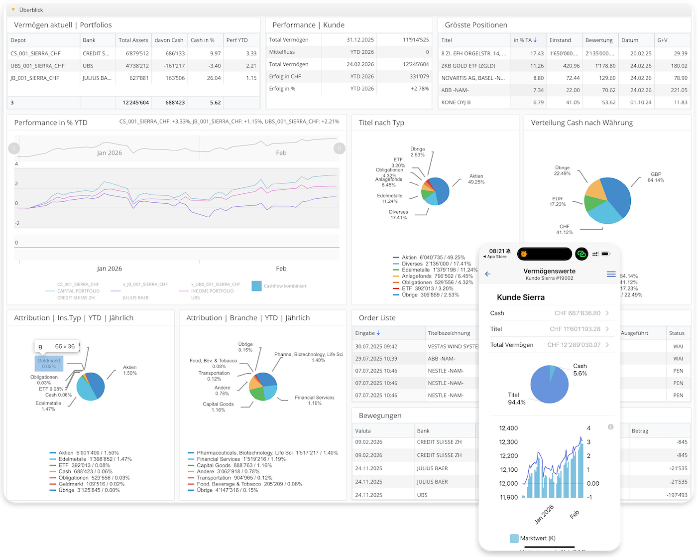 Vollständige Portfolioverwaltung mit automatisiertem Datenimport über 30+ Banken-APIs, Integration mit allen relevanten Schweizer Finanzinstituten. Complete portfolio management with automated data import via 30+ bank APIs, integration with all relevant Swiss financial institutions.